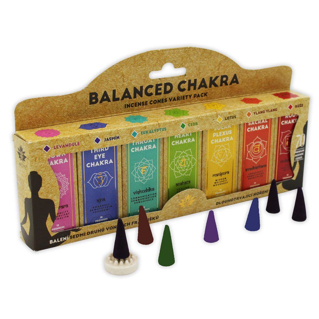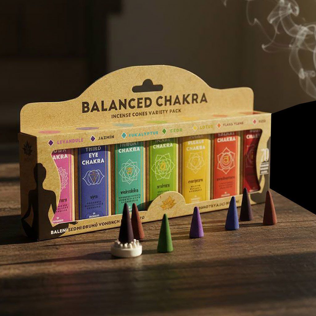 Barevná dárková krabička obsahuje 7 druhů františků po 10 kusech. Každý druh má svou barvu a vůni a je určen na podporu jedné určité čakry v našem těle.