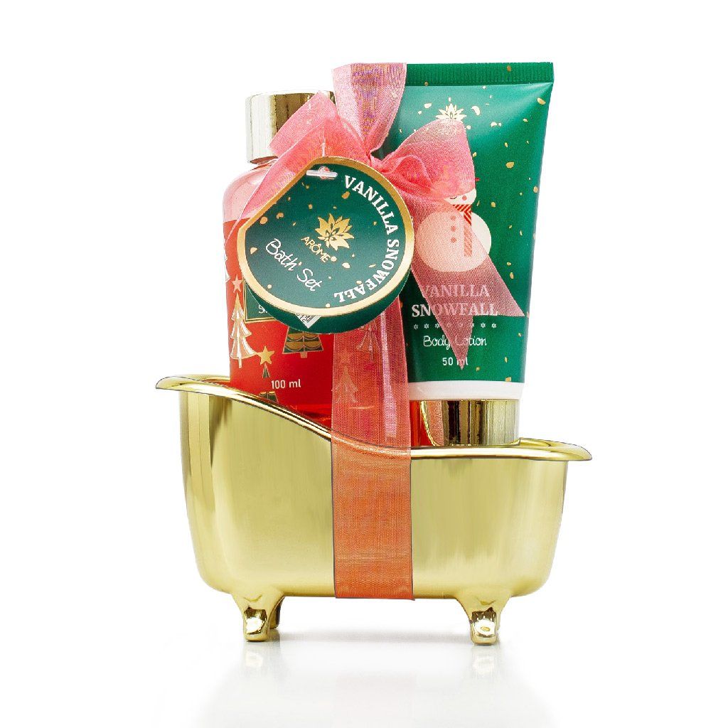 Luxusní dárková sada ARÔME Vanilla Snowfall přináší do koupelny vůni sladké vanilky a atmosféru zimní pohody. Elegantně zabalená v dekorativní zlaté vaničce, ozdobená mašlí a cedulkou, představuje ideální dárek pro všechny, kdo milují jemnou péči a vůni Vánoc.