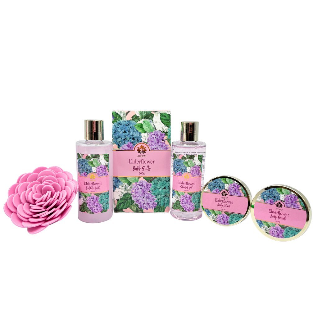- Obsahuje: pěna do koupele, sprchový gel, tělový peeling, tělové mléko, koupelová sůl, mycí houba