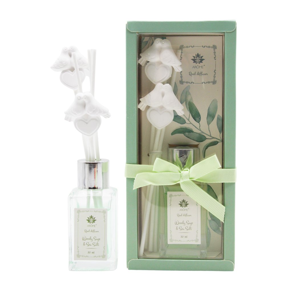 Bílé, stříbrné a zelené elegantní balení ARÔME difuzéru se čtyřmi tyčinkami a s dvěma ozdobnými vonnými jíly ve tvaru ptáčků a srdíčka. Aroma difuzér má neobvyklou vůni - dřevitá šalvěj a mořská sůl (Woody Sage & Sea Salt)