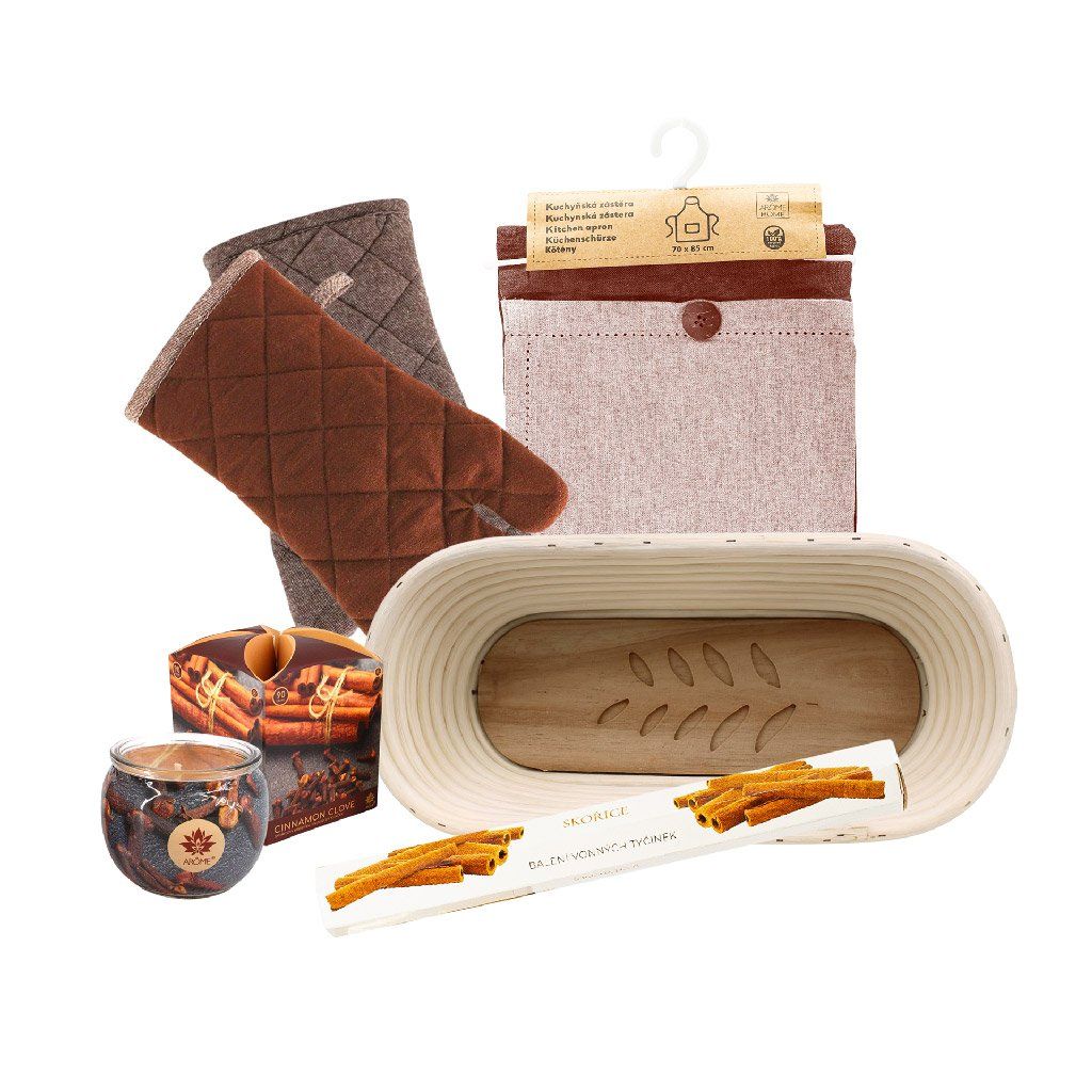 - Obsah balení: ošatka, chňapka, zástěra, svíčka, vonné tyčinky