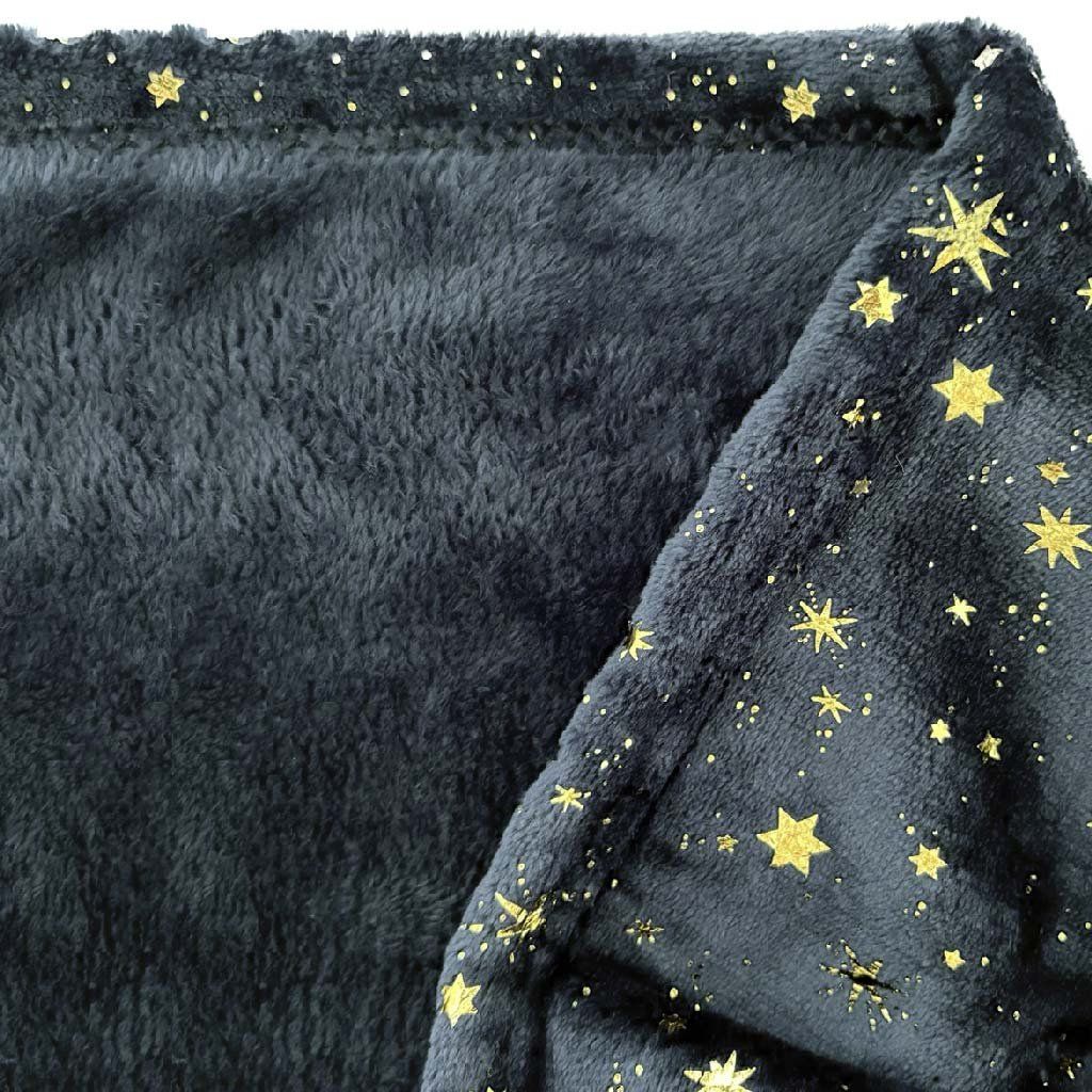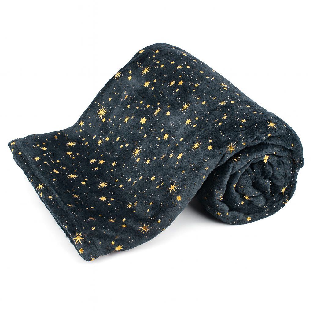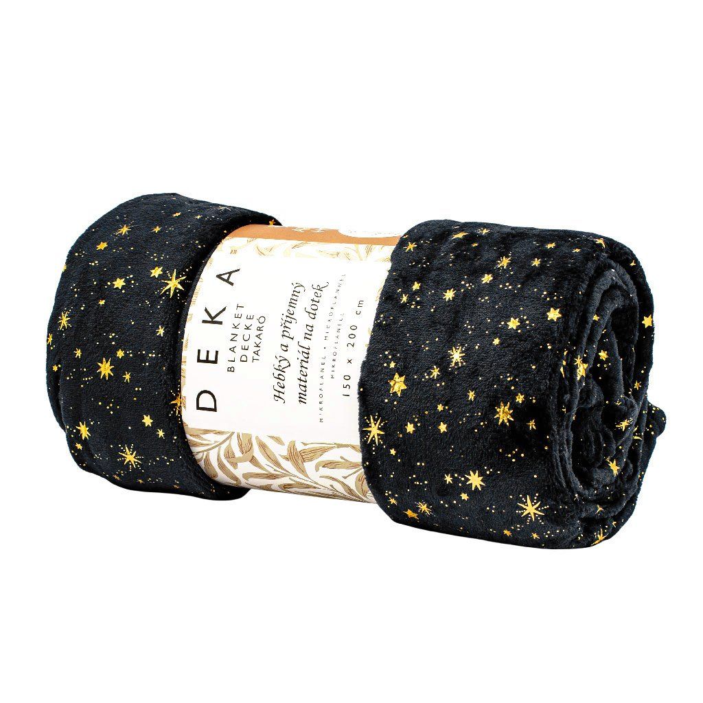 Přikryjte se noční oblohou s hebkou mikroplyšovou dekou v černé barvě se zlatými hvězdičkami. Hvězdný motiv dodá interiéru jemně slavnostní nádech, takže se skvěle hodí na gauč, do ložnice i do dětského pokoje. Sametově hladké mikrovlákno je příjemné k pokožce, hřeje a přitom zůstává lehké, takže je ideální pro každodenní relax i jako dekorativní přehoz. Snadná údržba – lze prát v pračce, rychle schne a drží tvar i barvy.