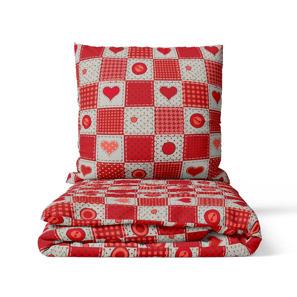 Zahalte svou ložnici do hebkosti a tepla s povlečením z mikroflanelu s romantickým motivem patchworku se srdíčky a knoflíky. Kombinace červených a šedých tónů navodí útulnou atmosféru domova.