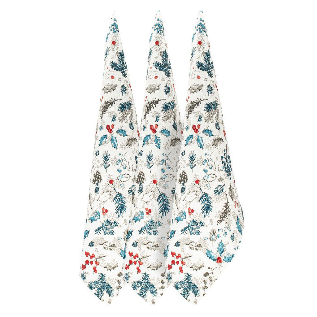 Utěrky v sadě 3 kusů jsou zdobené jemným přírodním motivem větviček, listů a bobulí v kombinaci zelených, šedých a červených tónů. Tento design působí elegantně a navozuje příjemnou zimní atmosféru.