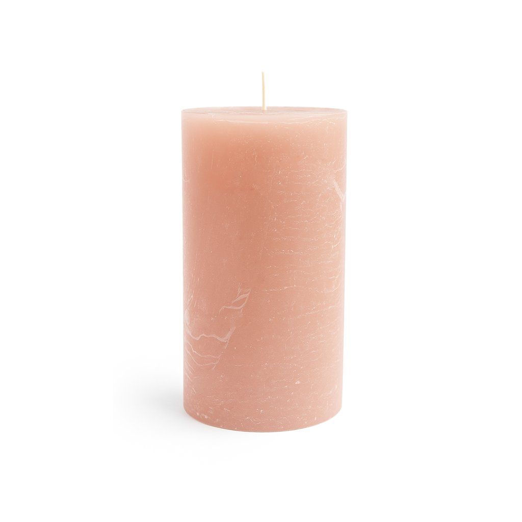 - Klasická svíčka ve tvaru válce s rustikálním vzhledem.