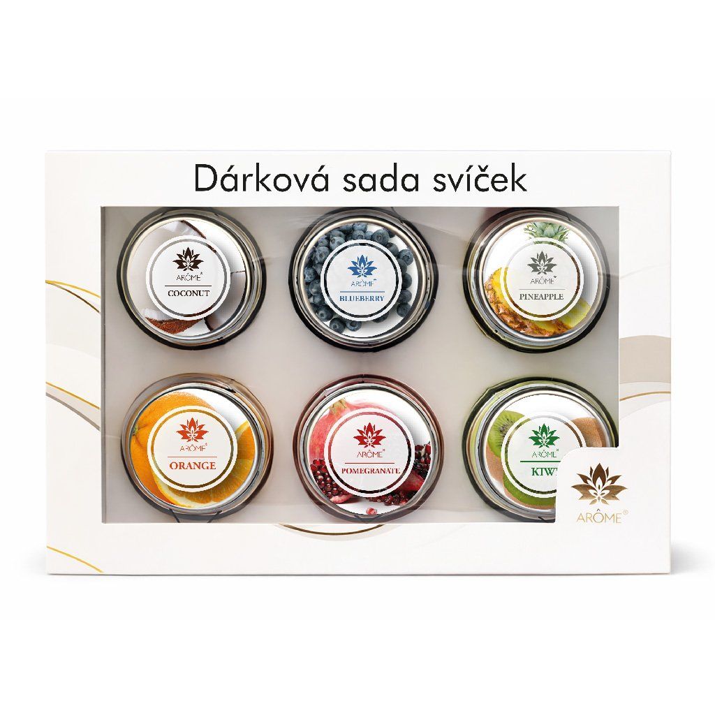 Luxusní dárková sada ARÔME obsahuje 6 ks svíček ve skleněných dózách, které doma vykouzlí příjemnou atmosféru a nádherně provoní interiér.