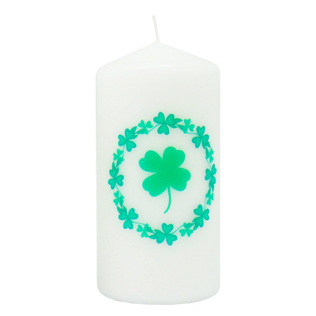 Bílá svíčka s motivem zeleného čtyřlístku a věnce z trojlístků přináší do domova symbol štěstí a pozitivní energie. Skvělá jako dárek nebo milá pozornost pro každou příležitost.