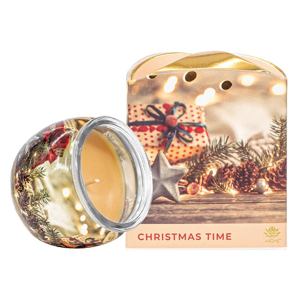 Plamínek svíčky s vůní brusinky a hřebíčku umocní slavnostní vánoční chvíle a vánočně zdobená svíčka bude i krásnou dekorací. Ve stejném designu jako svíčka je i dárková krabička s vánočními motivy.
