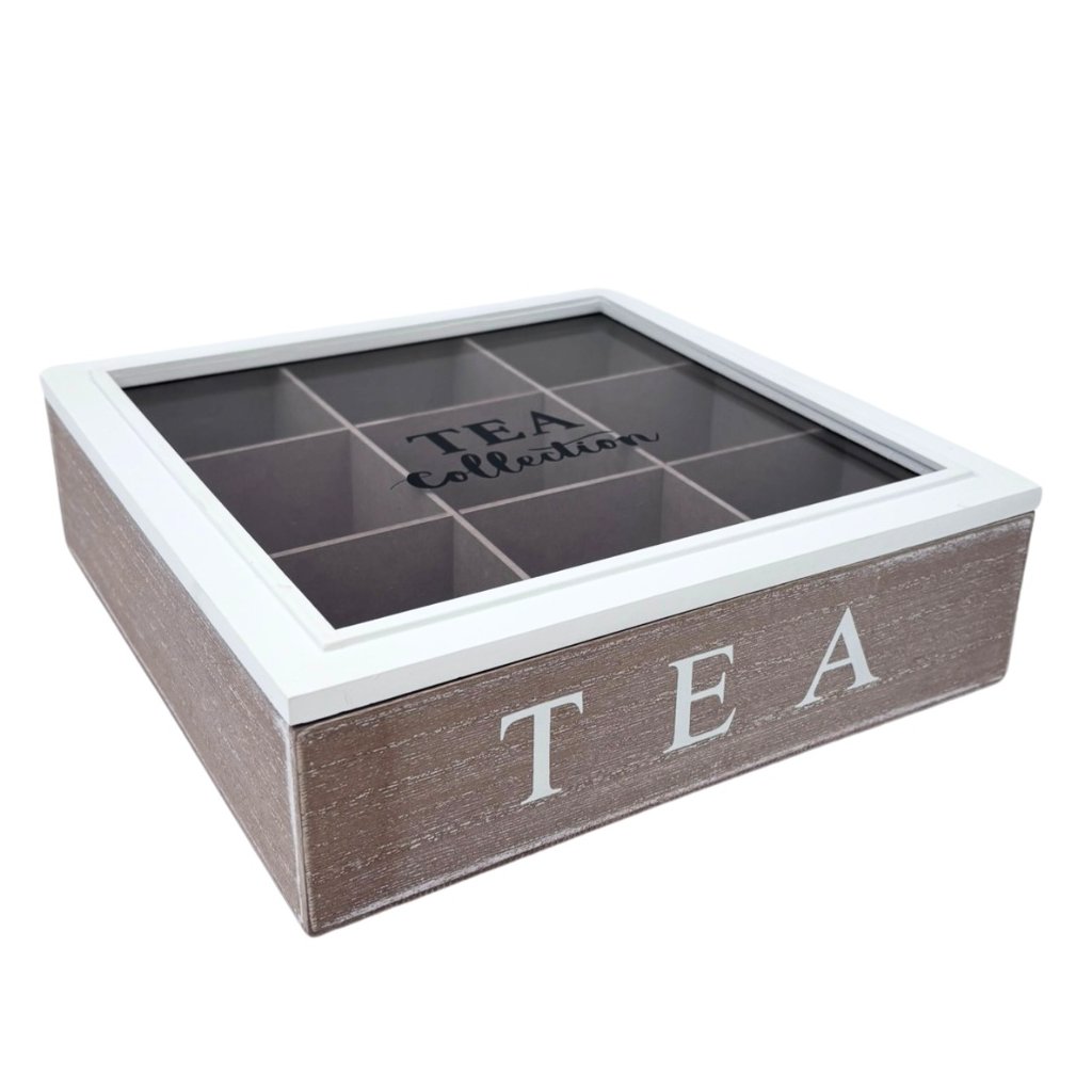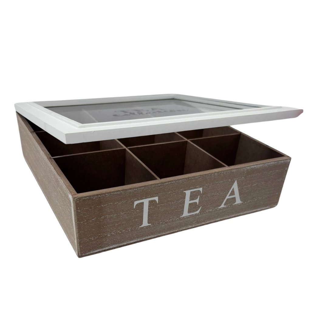 Krabička na čaj s 9 přihrádkami a skleněným průhledem ve víku. Rozměr 24 x 24 x 7 cm. Barva přírodní a bílé víko.