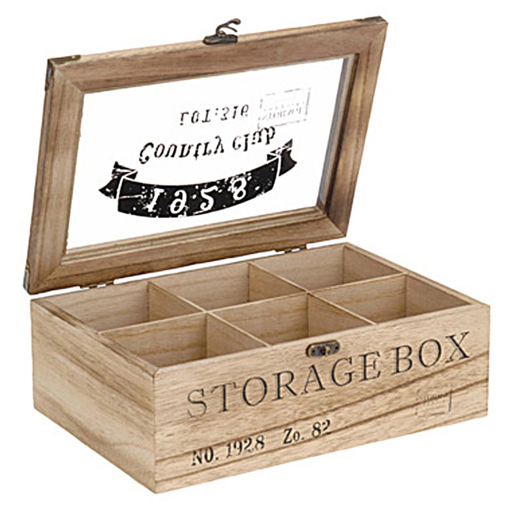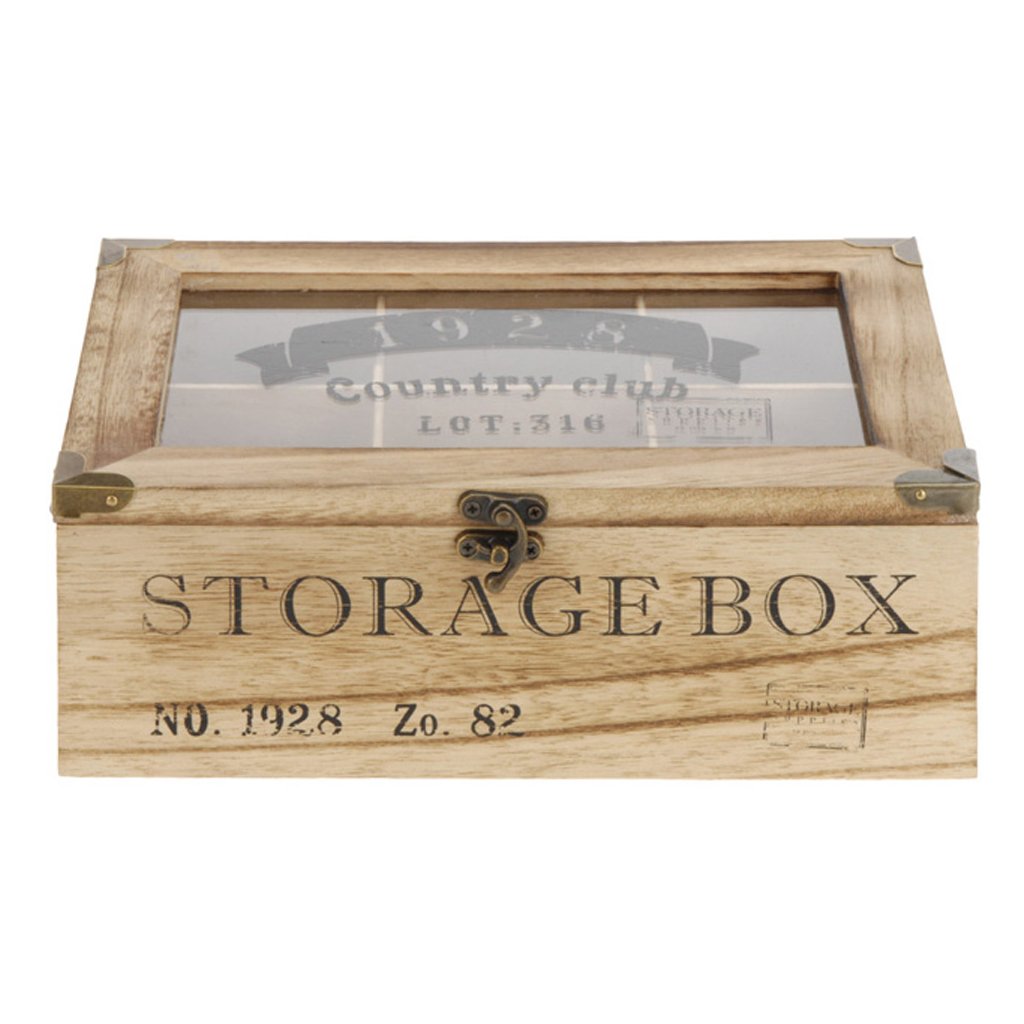 Díky 6 přihrádkám můžete mít v této krásné krabičce na čaj uspořádané své oblíbené čaje. Luxusní box na čaj je vyroben ze dřeva a má průhledné skleněné víko s potiskem loga a textu "Country Club 1982" na horní straně a "Storage Box" na přední straně.