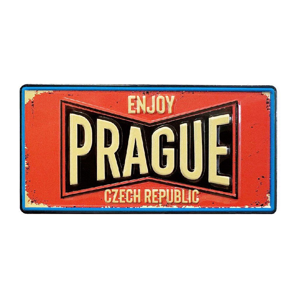 Pevný kovový magnet o velikosti 4 × 8 cm s nápisem "ENJOY PRAGUE CZECH REPUBLIC" ve vintage provedení. Skvěle drží na lednici, magnetické tabuli i jiných kovových plochách.