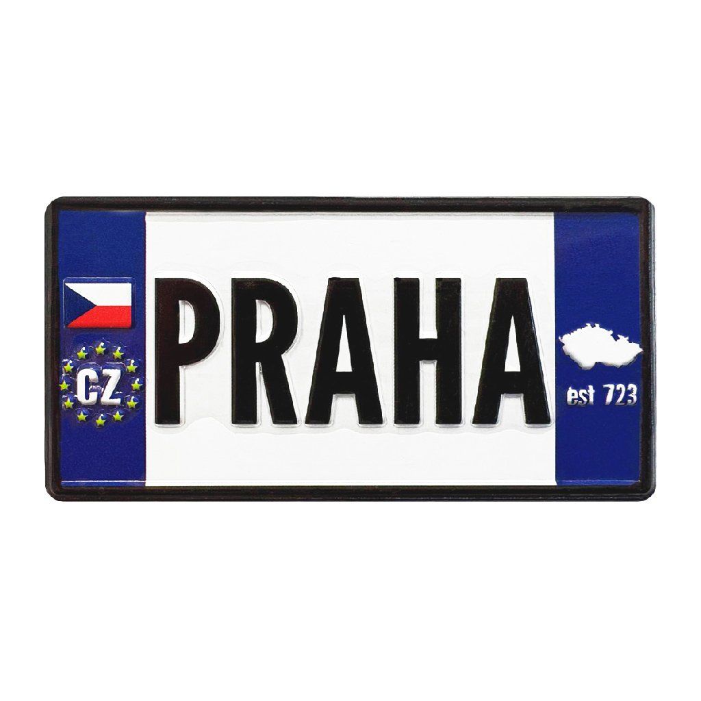 Pevný kovový magnet o velikosti 4 × 8 cm s nápisem PRAHA a designem připomínající registrační značku.