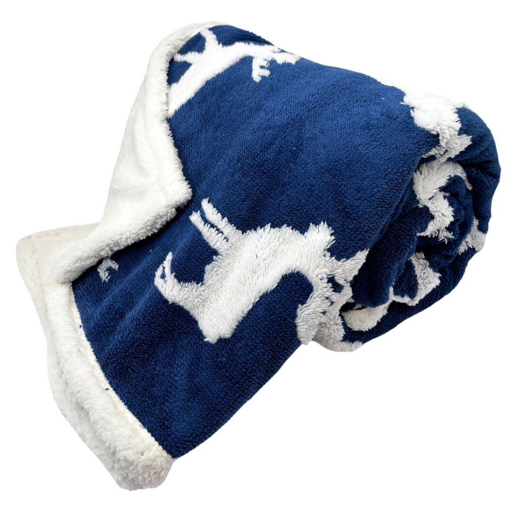Teplá mikroflanelová deka s beránkem. Modrá s bílým jacquardovým vzorem losů, 150 x 200 cm