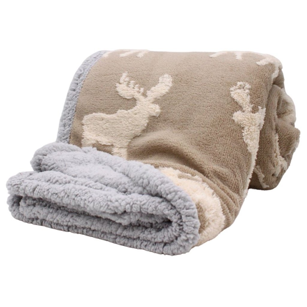 Teplá mikroflanelová deka s beránkem. Béžová s bílým jacquardovým vzorem losů, 50 x 200 cm