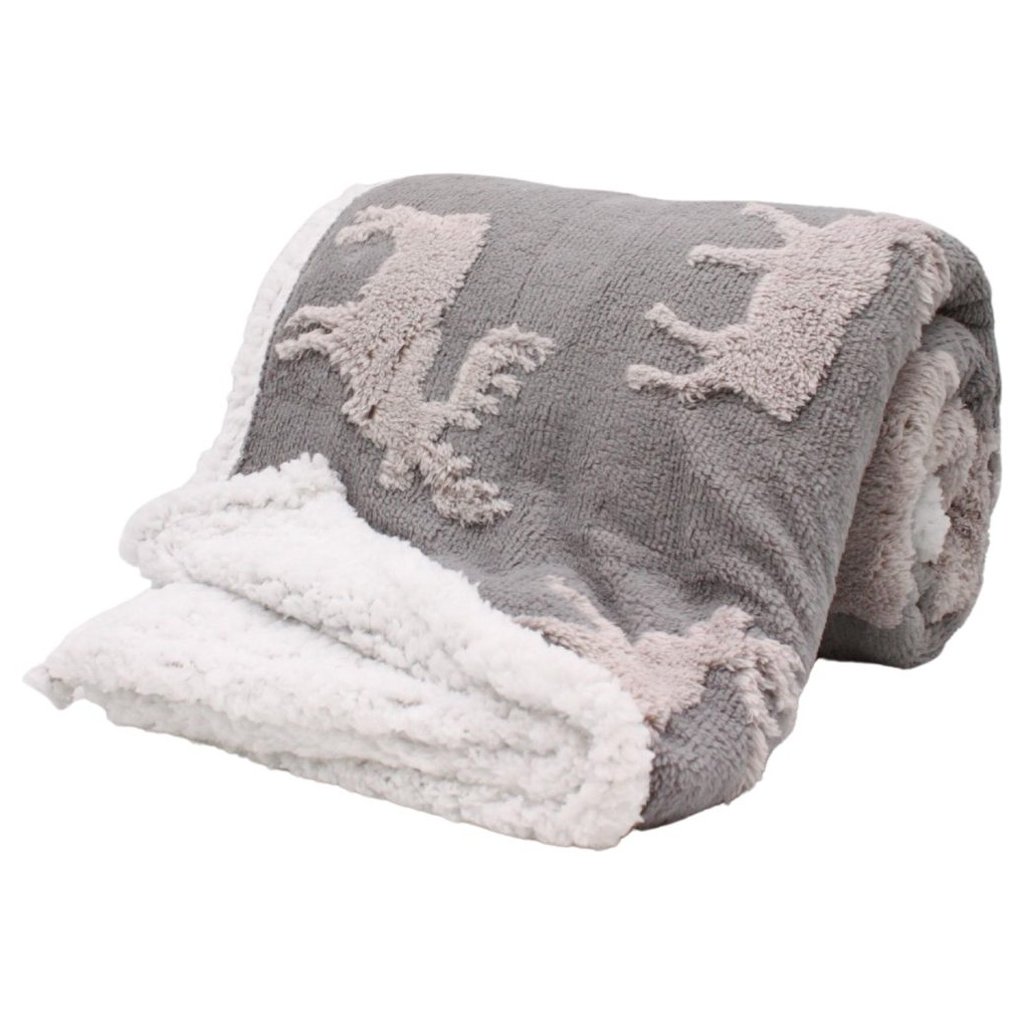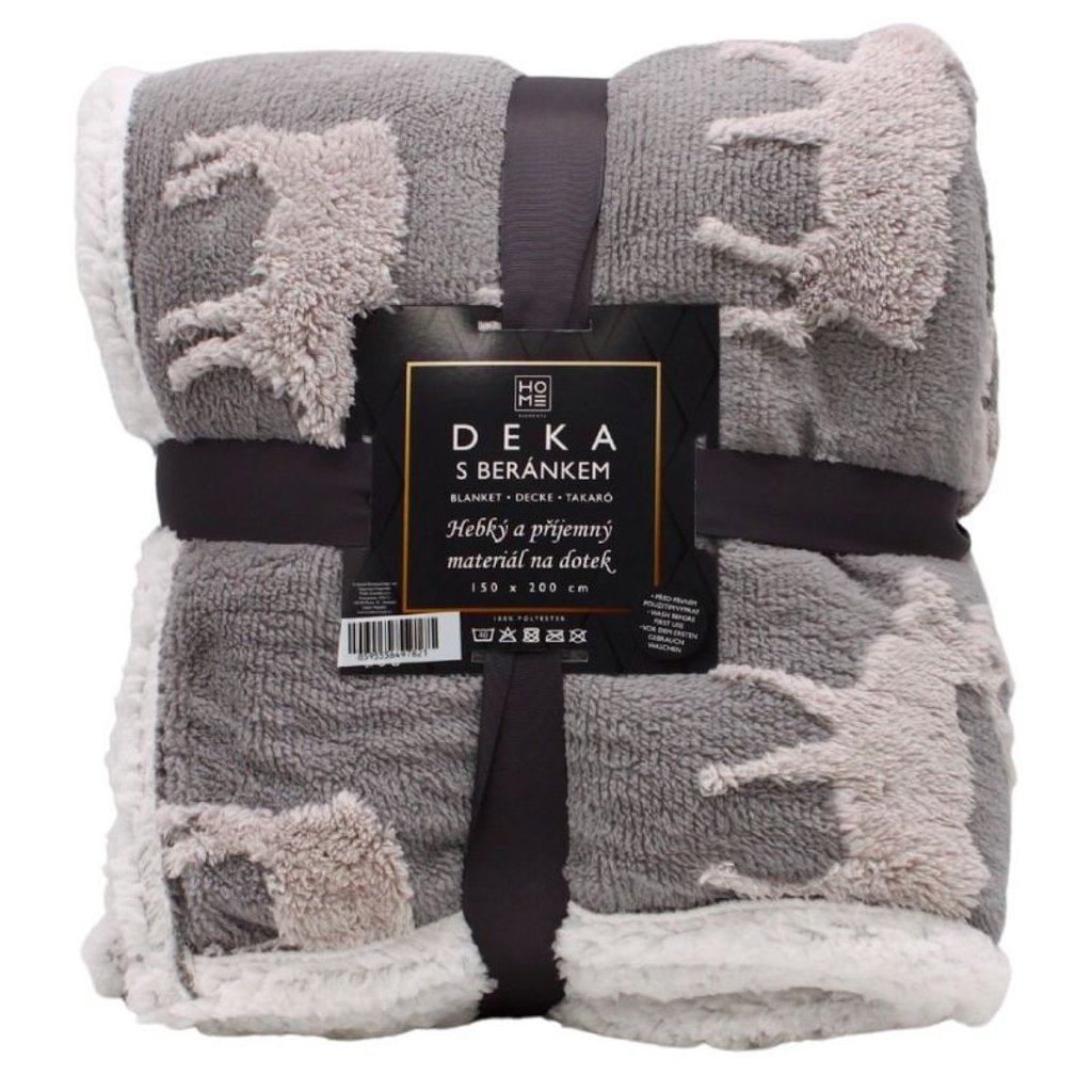 Deka má žakárový vzor losů na šedém pozadí. Z druhé strany je beránek v bílé barvě.