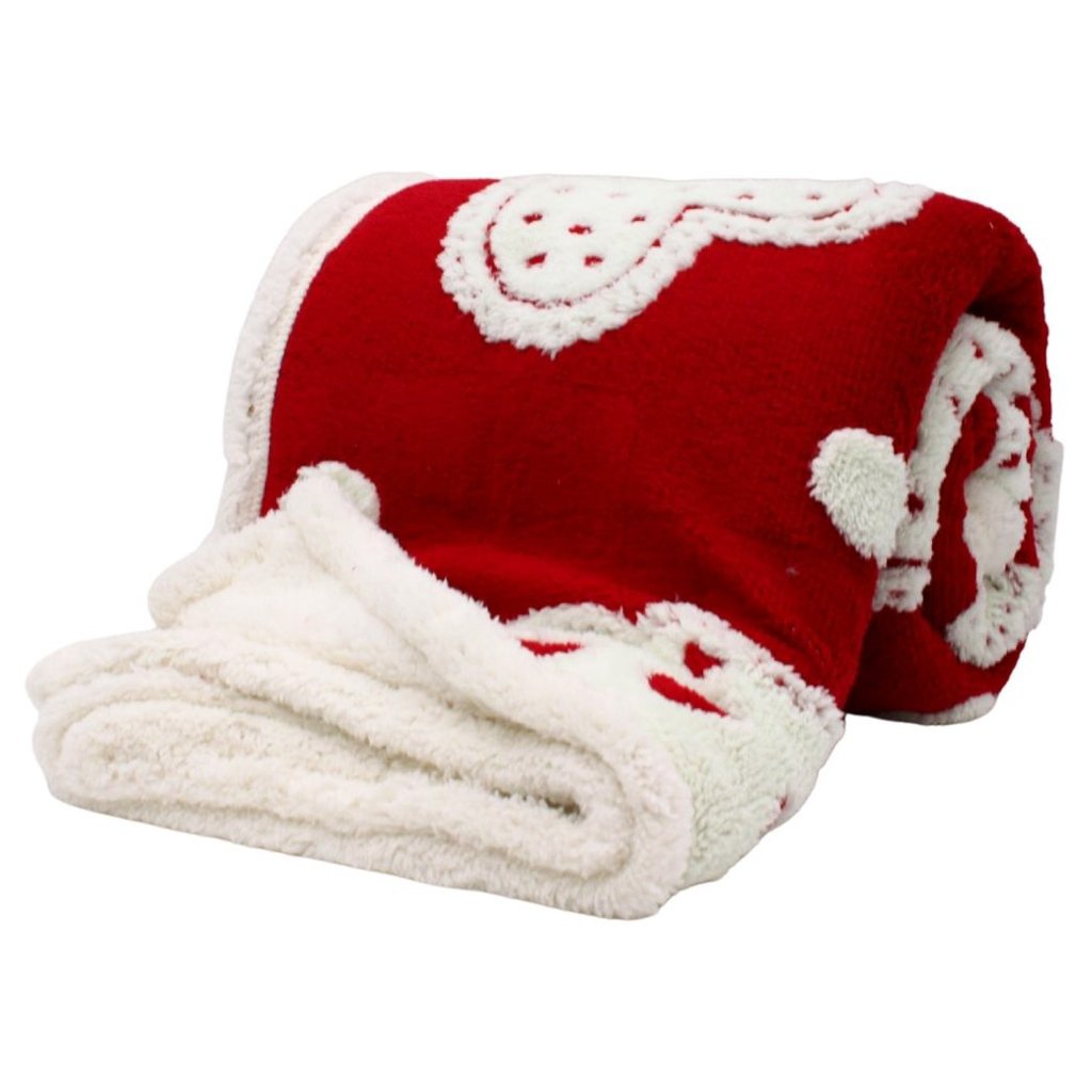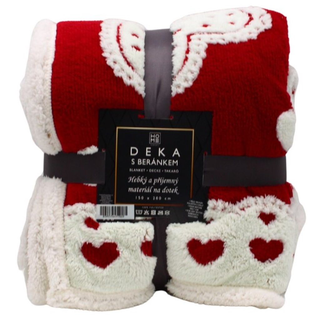 Deka má žakárový vzor srdcí a srdíček na červeném pozadí. Z druhé strany je beránek v bílé barvě. Deka skvěle doplní třeba dívčí pokojíček.