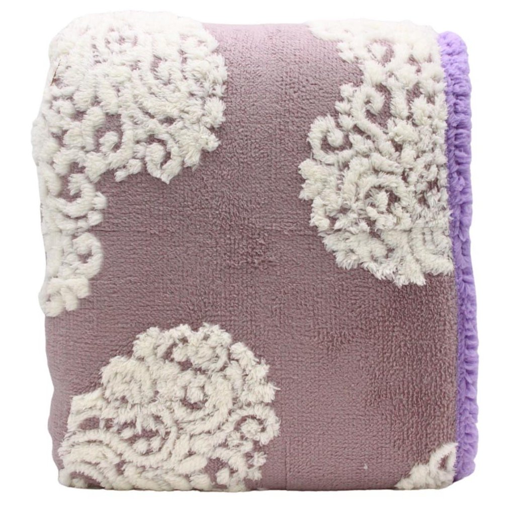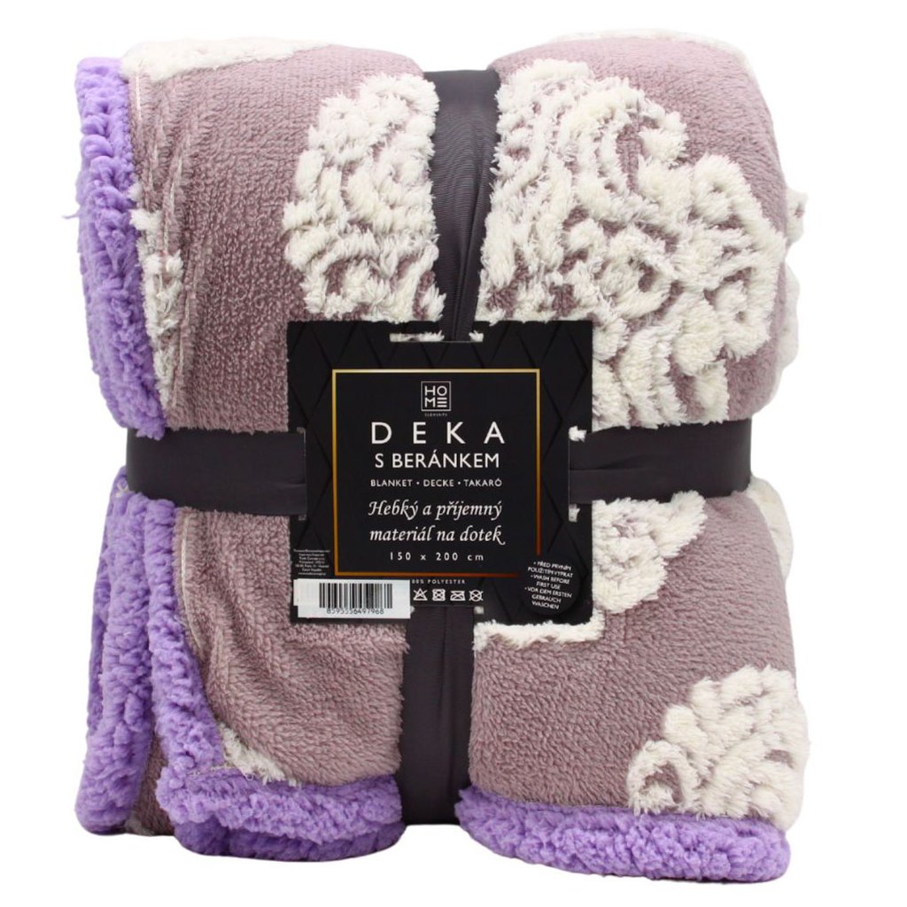 Deka má žakárový vzor bílých květů a ornamentů na šedofialovém pozadí. Na druhé straně je beránek ve fialové barvě.