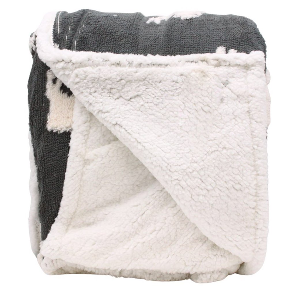 Deka má žakárový vzor bílých losů na tmavě šedém pozadí. Z druhé strany je beránek v bílé barvě. Deka skvěle doplní třeba studentský pokoj.