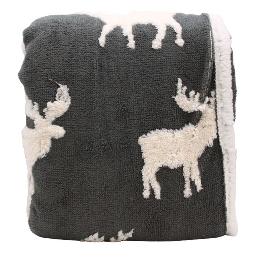 Teplá mikroflanelová deka s beránkem. Šedá s bílým beránkem a jacquardovým vzorem losů, 150 x 200 cm