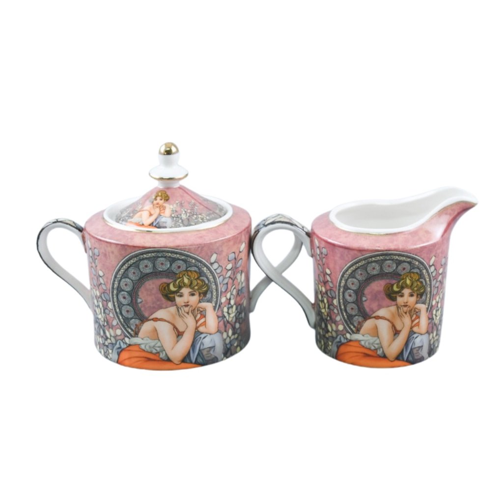 Cukřenka a mléčenka zdobená krásným vkusným dekorem z díla Alfonse Muchy doplňuje naši kolekci porcelánu s replikou tohoto slavného malíře.
