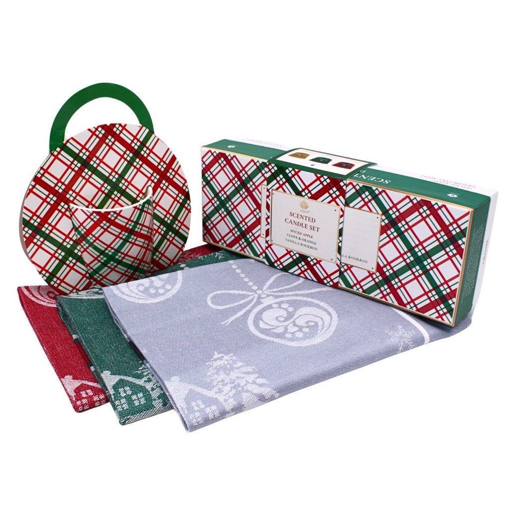 Vánoční dárková sada obsahuje 3 utěrky, velký hrnek a sadu 3 svíček s vánoční vůní.