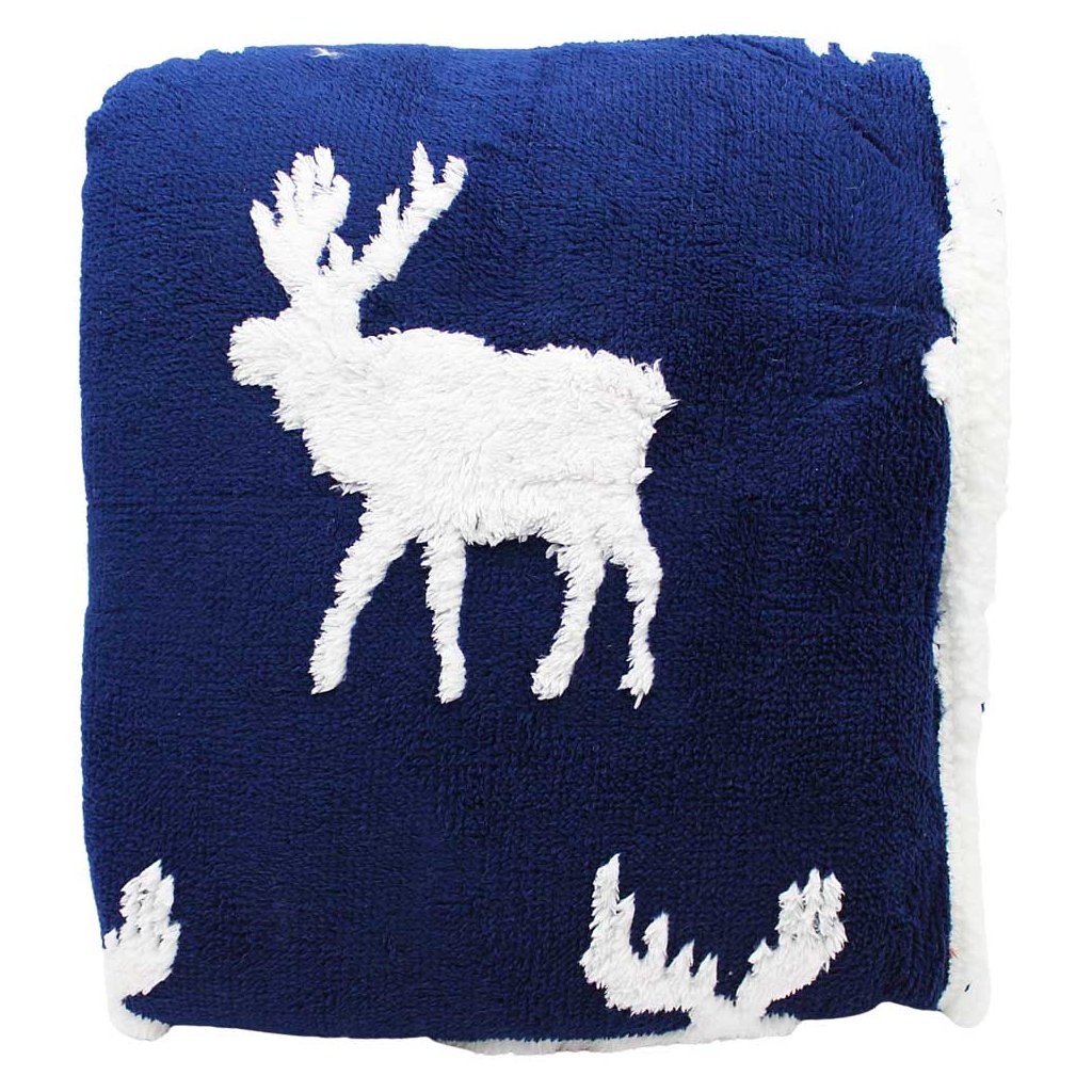 Teplá mikroflanelová deka s beránkem. Modrá s bílým jacquardovým vzorem losů, 150 x 200 cm