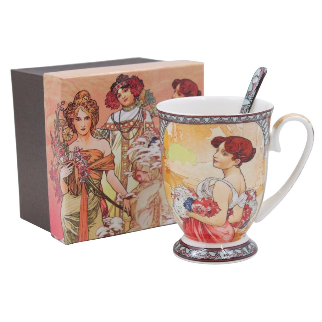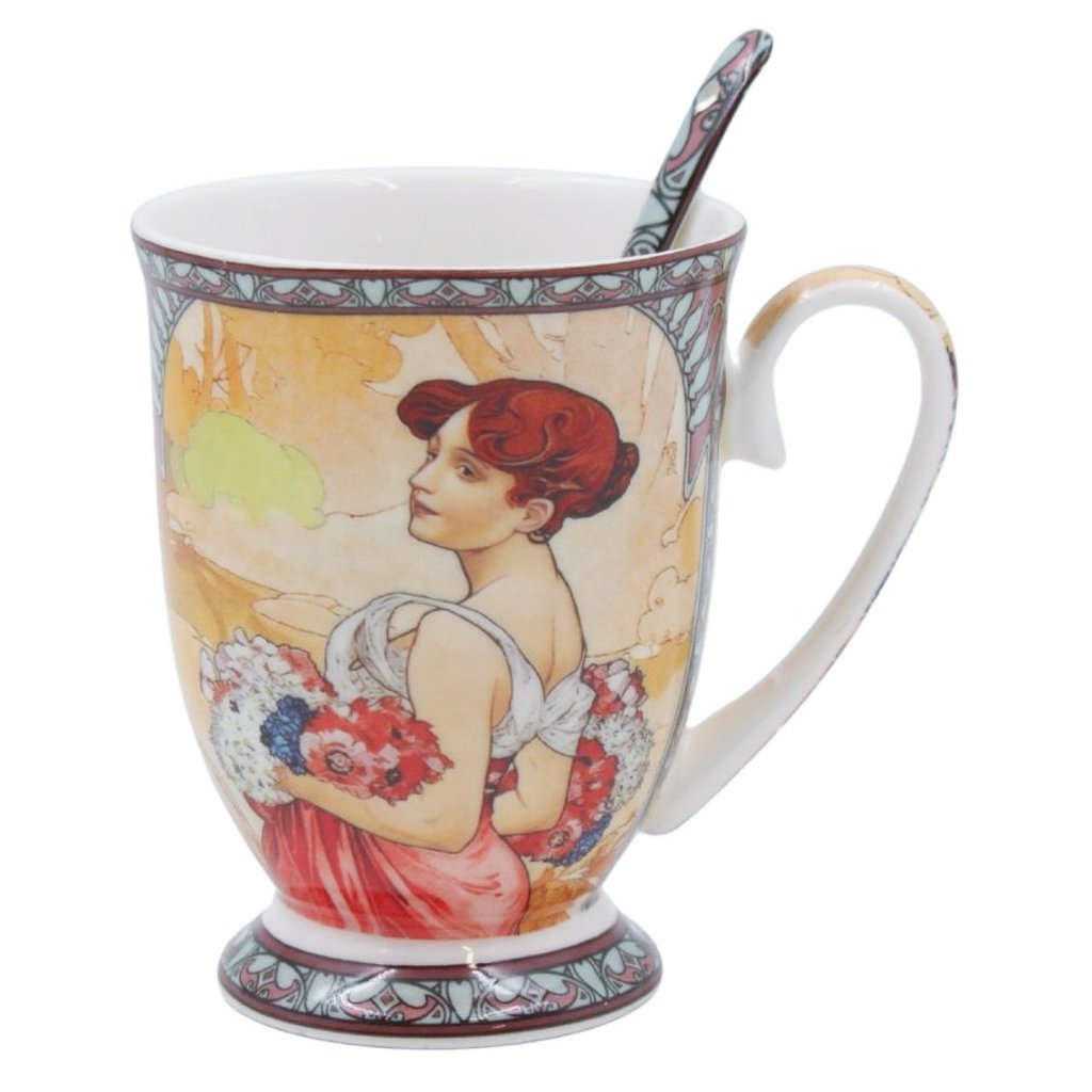 Větší porcelánový hrnek s porcelánovou lžičkou na čaj, vídeňskou kávu nebo čokoládu. Vyniká krásným dekorem z díla Alfonse Muchy, Léto, originálním tvarem i dárkovým balením.