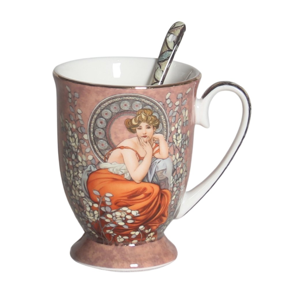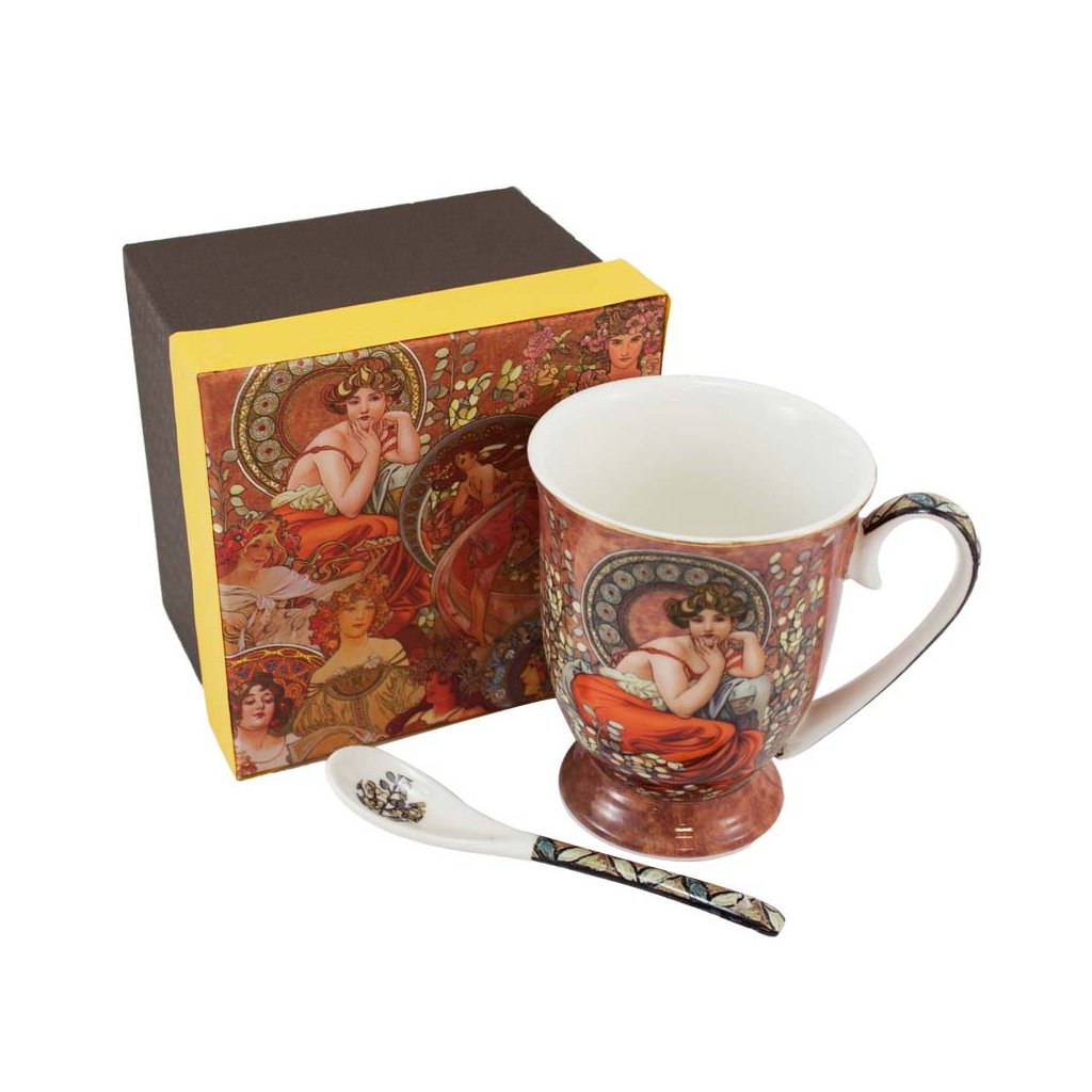 Exkluzivní dílo malíře Alfonse Muchy na porcelánovém hrnku se lžičkou, který se skvěle hodí na čaj, vídeňskou kávu nebo třeba horkou čokoládu.