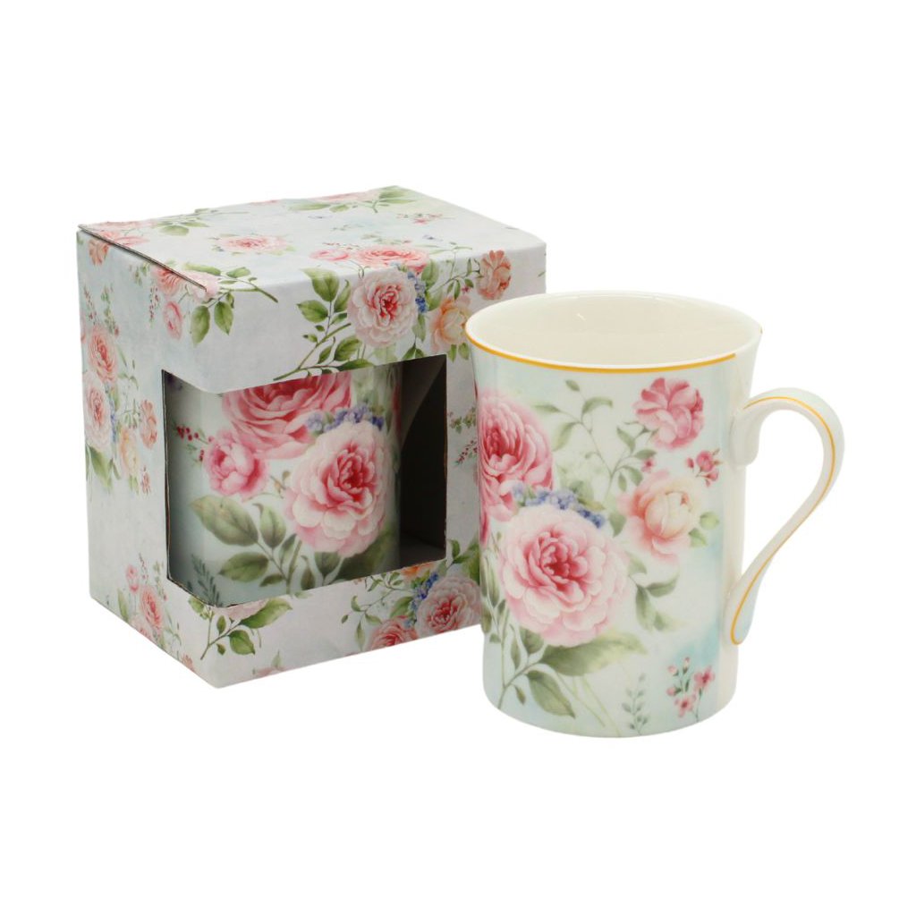 Porcelánový hrnek s dekorem květů růže, objem 300 ml. V dárkové krabičce.