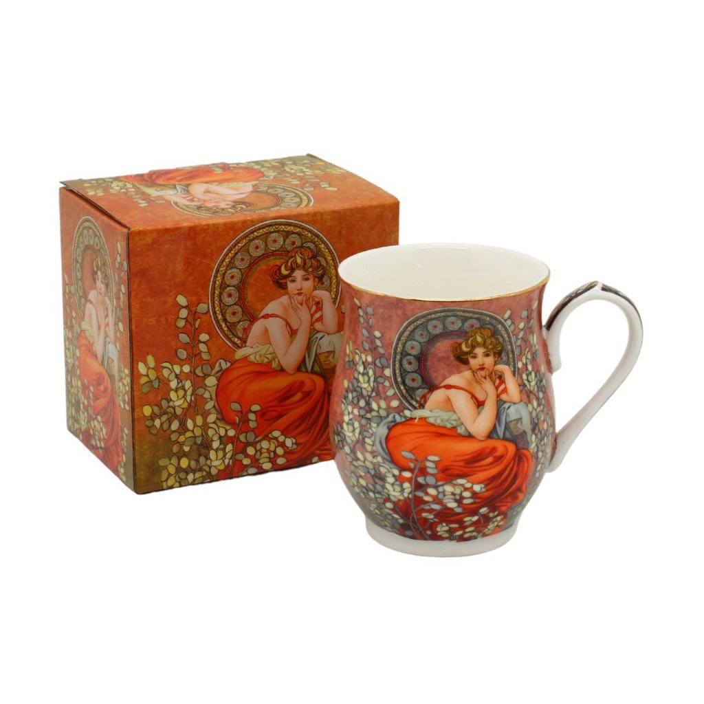 Větší porcelánový hrnek na čaj, svařák, vídeňskou kávu nebo horkou čokoládu. Vyniká krásným dekorem z díla Alfonse Muchy, originálním tvarem i dárkovým balením.