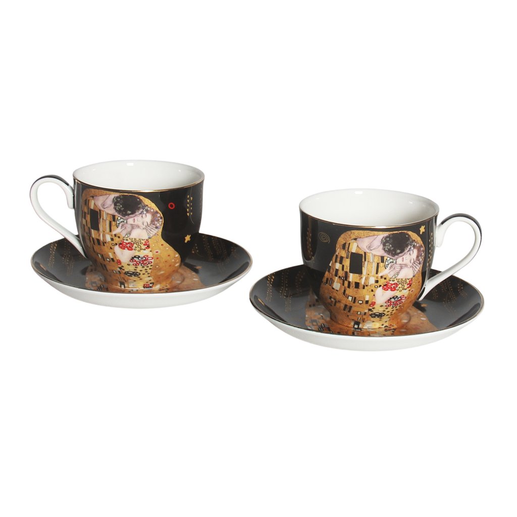 Exkluzivní porcelánová sada dvou hrnků s podšálky s dekorem mistrovského díla slavného malíře Gustava Klimta. Pořiďte k hrnečkům další porcelánové kousky ze stejné kolekce, které mohou sloužit i jako dekorace. Jemná zlatá a černá barva se hodí i do moderních interiérů. Baleno v dárkové krabičce. Pro obdivovatele díla tohoto malíře bude skvělým dárkem.