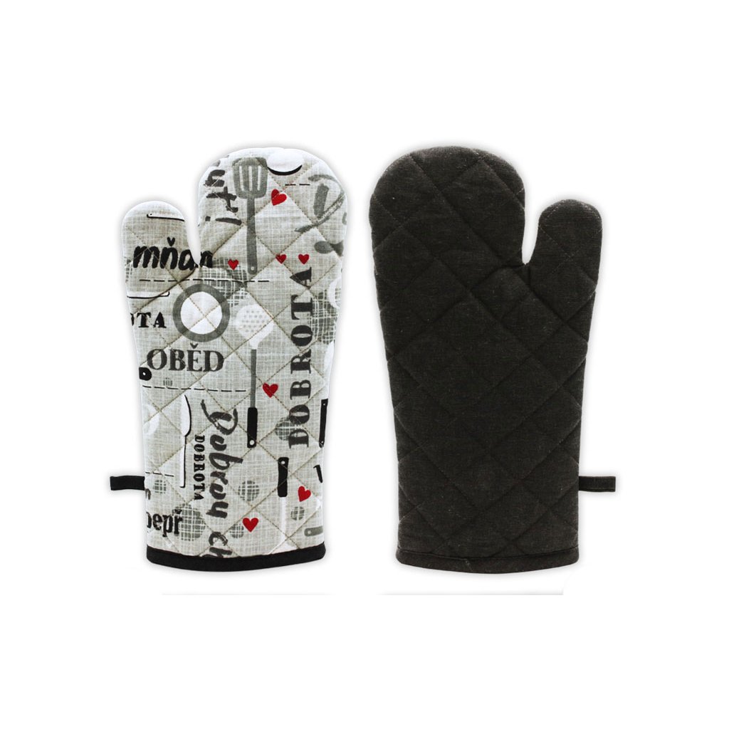 Chňapka má všitý magnet a poutko pro zavěšení podle potřeby. Z jedné strany je tmavě šedá, z druhé strany ji zdobí kuchyňské motivy a texty. Ve stejných barvách a se stejnými motivy můžete mít z našeho eshopu další kuchyňský textil.