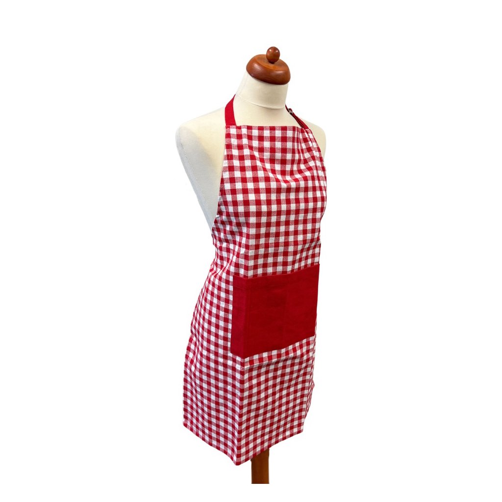 Slušivá kuchyňská bavlněná zástěra v červeném káru s praktickou kapsičkou. Vyplatí se při vaření používat, vaše oblečení zůstane čisté. Zástěra má univerzální velikost, lze nastavit šířku i výšku.