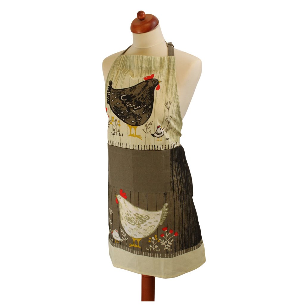 Kuchyňská zástěra, rozměr 60*80 cm, s motivem z kolekce Slepičky. Univerzální velikost. Barva hnědá, bílá a šedá.