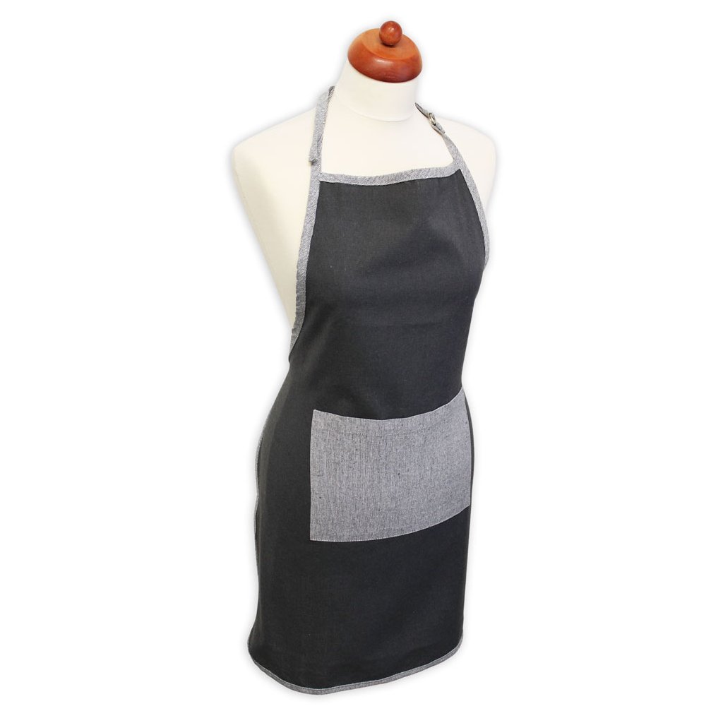 Ve slušivé kuchyňské zástěře se dobře vaří - v pohodě a bez obav z ušpinění. Šedá zástěra s světlou praktickou kapsičkou a lemováním je ušita z recyklované bavlny. Nastavitelné šňůrky za krkem upraví zástěru na potřebnou velikost.