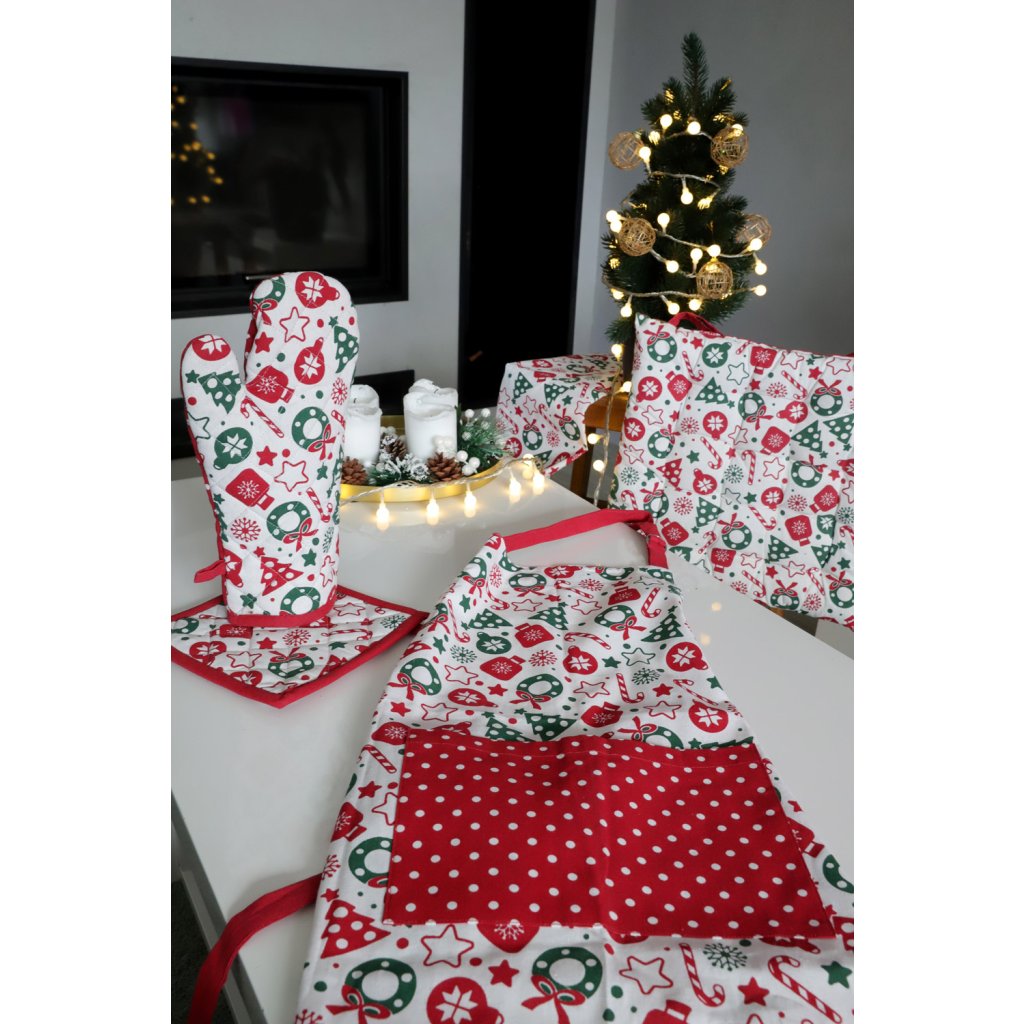 Veselá vánoční kuchyňská zástěra s praktickou kapsičkou je zdobená oblíbeným vzorem Vánočních sladkostí. Zástěra ochrání šaty při vaření a naladí vás na tu správnou vánoční atmosféru. Zástěra má univerzální velikost, lze nastavit šířku i výšku.