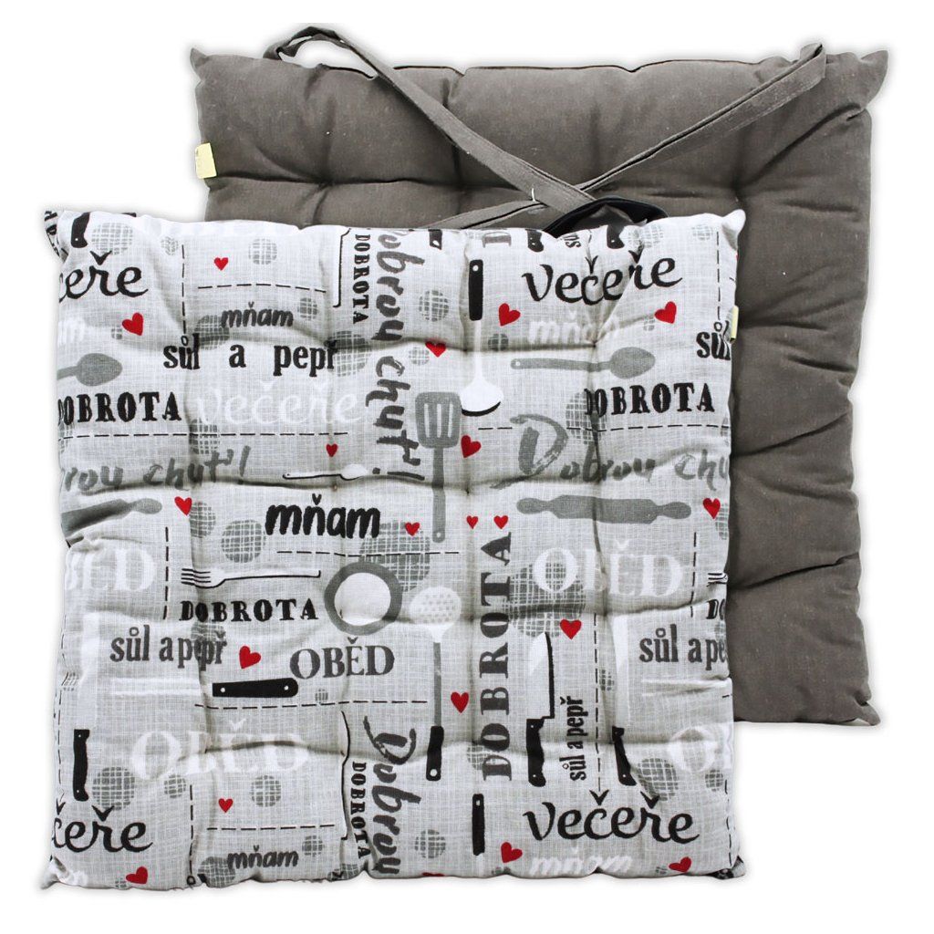 Zpříjemněte si posezení s tímto prošívaným podsedákem od značky Home Elements. Design s kuchyňskými motivy a nápisem "Dobrou chuť" dodá vašemu interiéru útulný a stylový nádech.