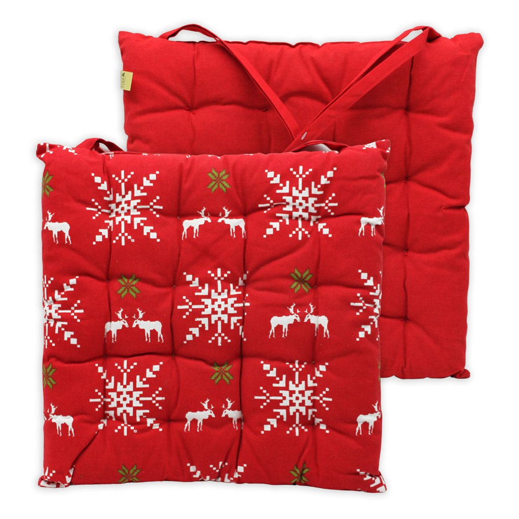 Tento prošívaný podsedák zdobí na jedné straně vánoční motiv hvězdiček a sobů, druhá strana je jednobarevná, červená. Poskytne pohodlné sezení, tepelnou izolaci i krásnou dekoraci židle.