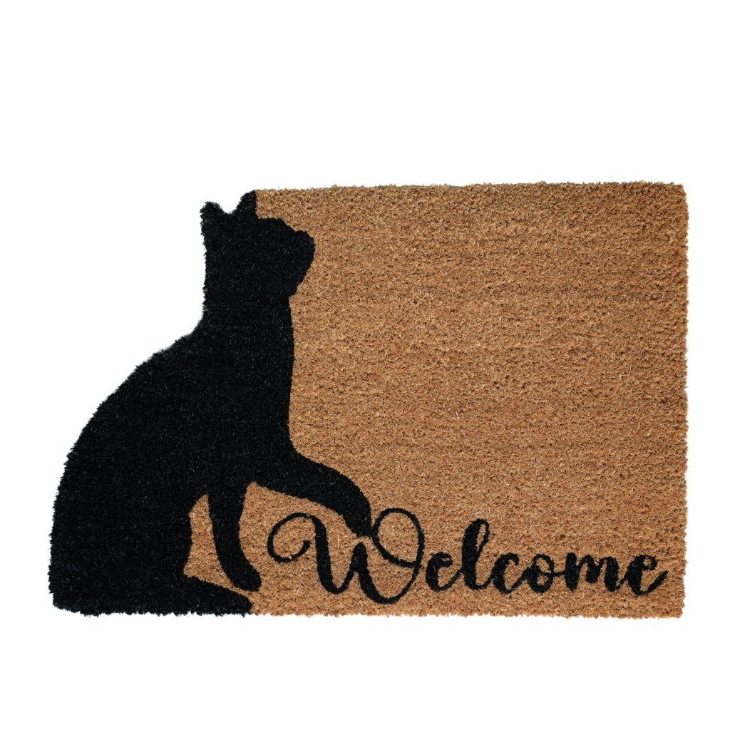 Pro milovníky koček nabízíme pěknou rohožku z kokosových vláken v přírodní barvě s nápisem Welcome a s černou siluetou kočky.