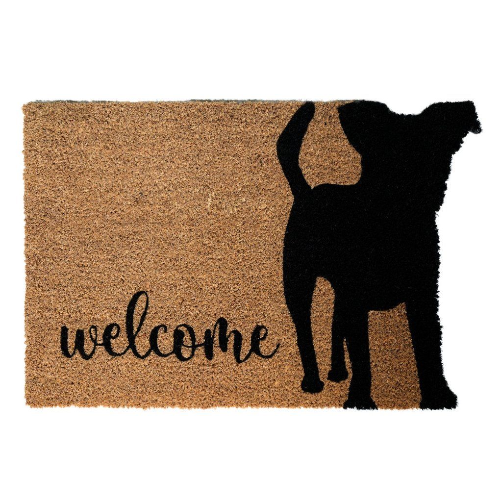 Pěkná rohožka z kokosových vláken v přírodní barvě s nápisem Welcome a černou siluetou psa bude ozdobou a vizitkou vašich vstupních dveří.