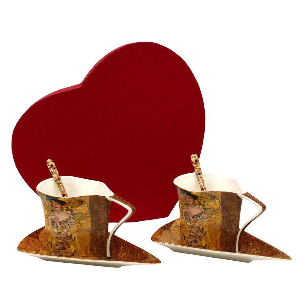 Porcelánová sada 2 kusů netradičně tvarovaných šálků a podšálků se lžičkami zdobených replikou slavného obrazu Gustava Klimta Zlatá Adéla. Objem 250 ml.