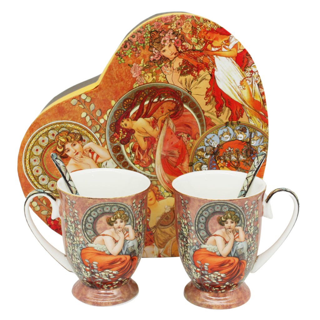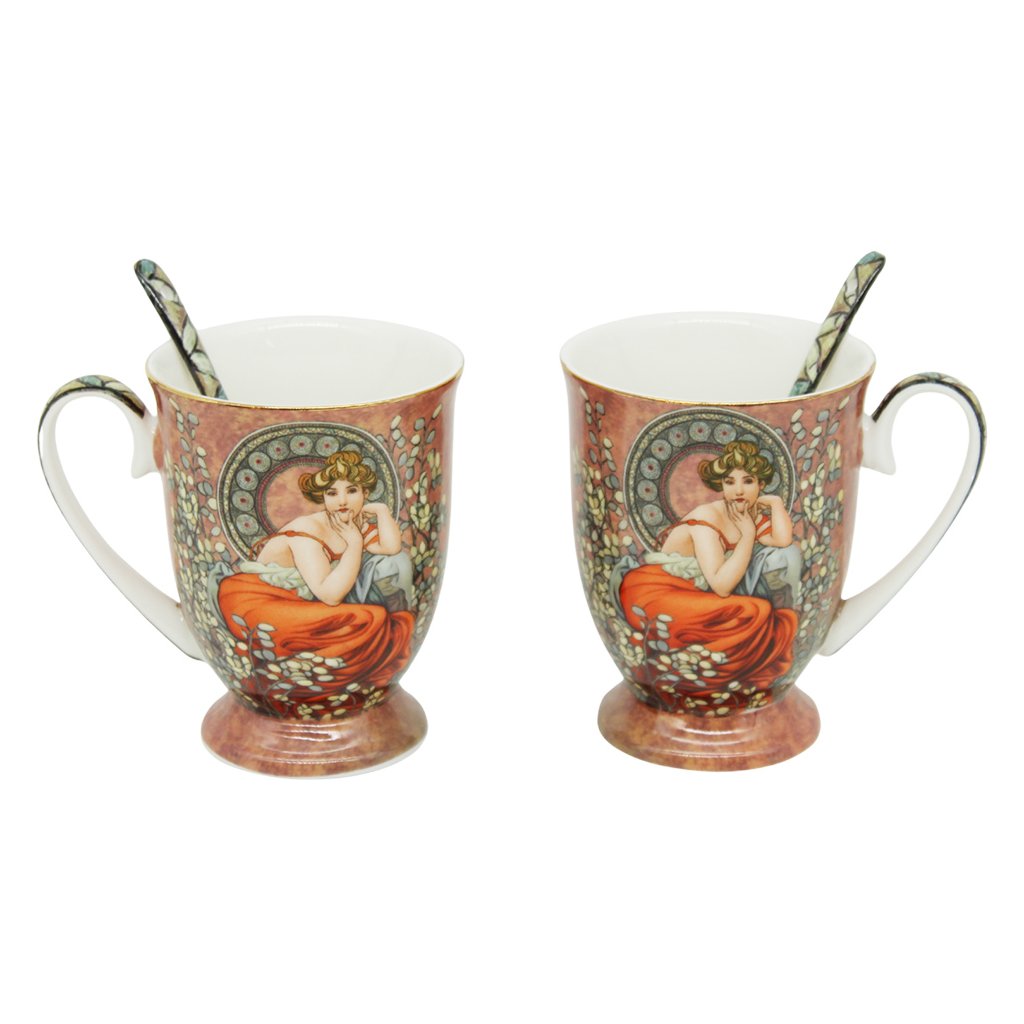Sada 2 kusů tvarovaných porcelánových hrnků 280 ml se lžičkami. Dekor v tmavém odstínu z díla Alfonse Muchy. V dárkové krabičce.