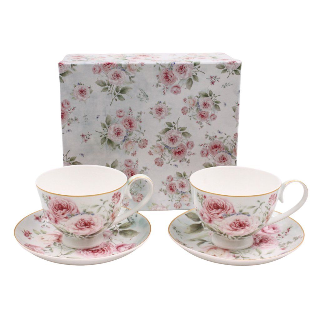 Sada dvou porcelánových šálků s podšálky na kávu nebo čaj. Jemný dekor s květy růže vypadá nádherně a luxusně. Baleno v dárkové krabičce.
