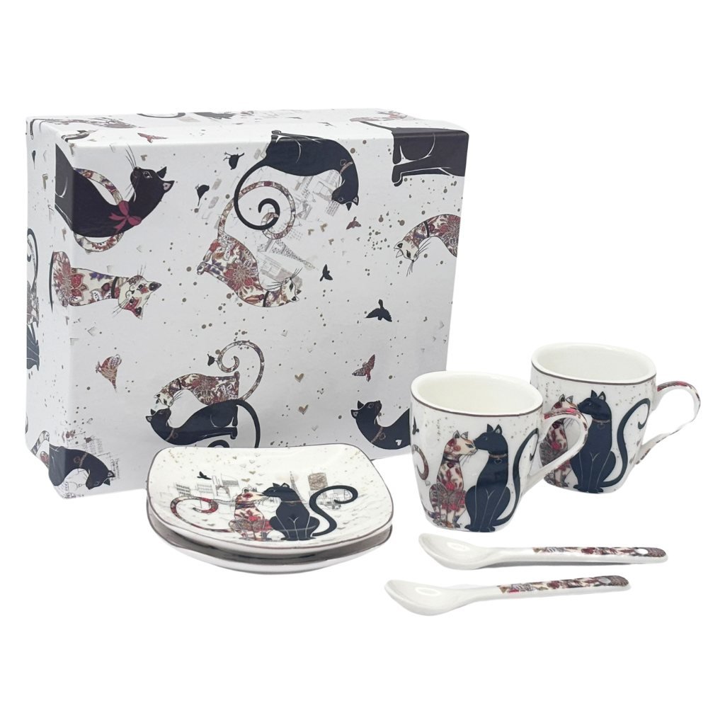 Luxusní dárková sada 2 kusů porcelánových šálků s podšálky a lžičkami, vhodná především na espresso. Elegantní krásné šálky s krásným motivem koček navodí slavnostní atmosféru, vaši oblíbenou kávu si opravdu vychutnáte. Sada je poskládaná do dárkové krabičky ve stejném dekoru.