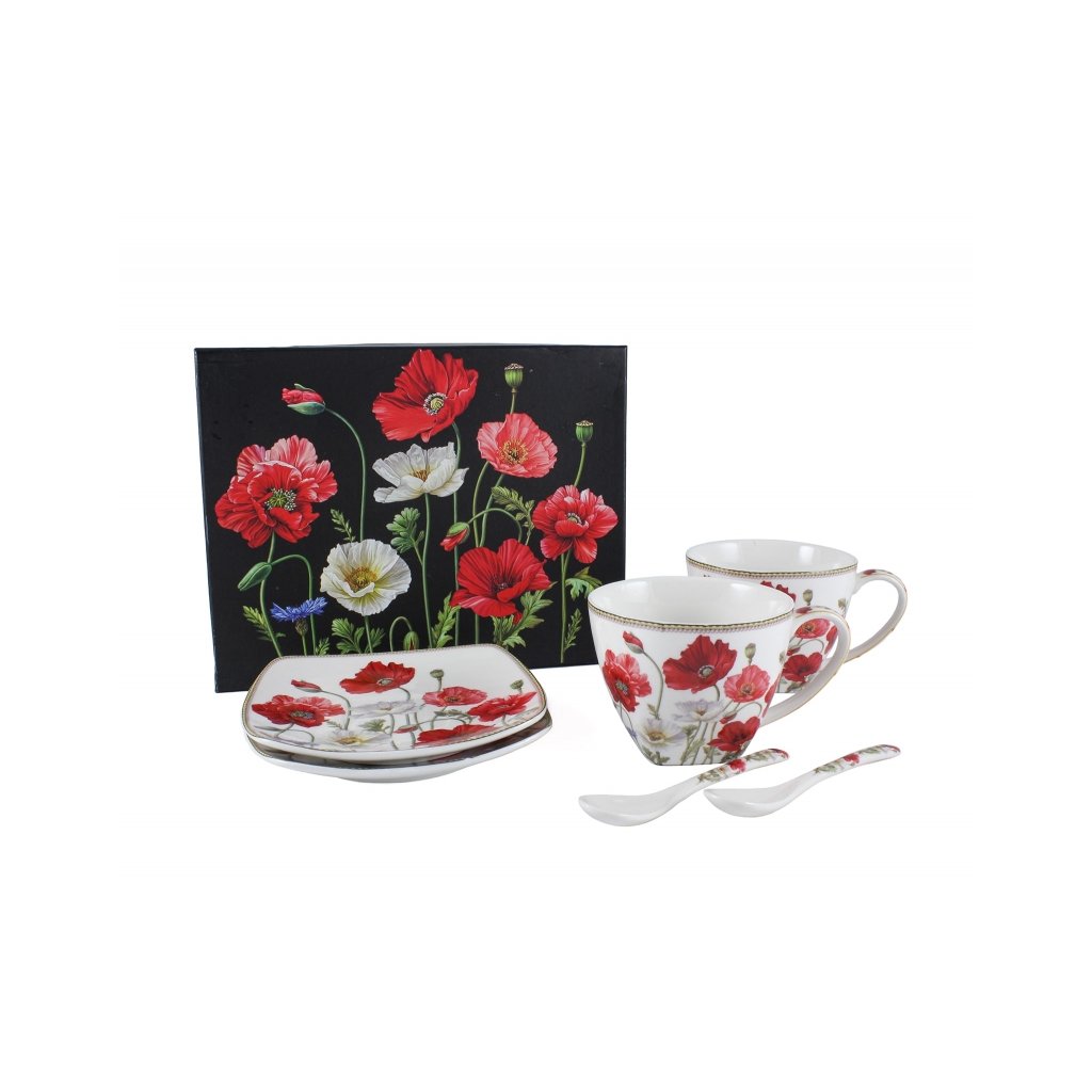 Porcelánová sada 2 kusů šálků s podšálky a lžičkami zdobená půvabnými červenými a bílými kvítky rozkvetlého máku. Je povznášející vychutnávat si čaj nebo kávu z tak krásného šálku, nejlépe s milovanou nejbližší osobou.