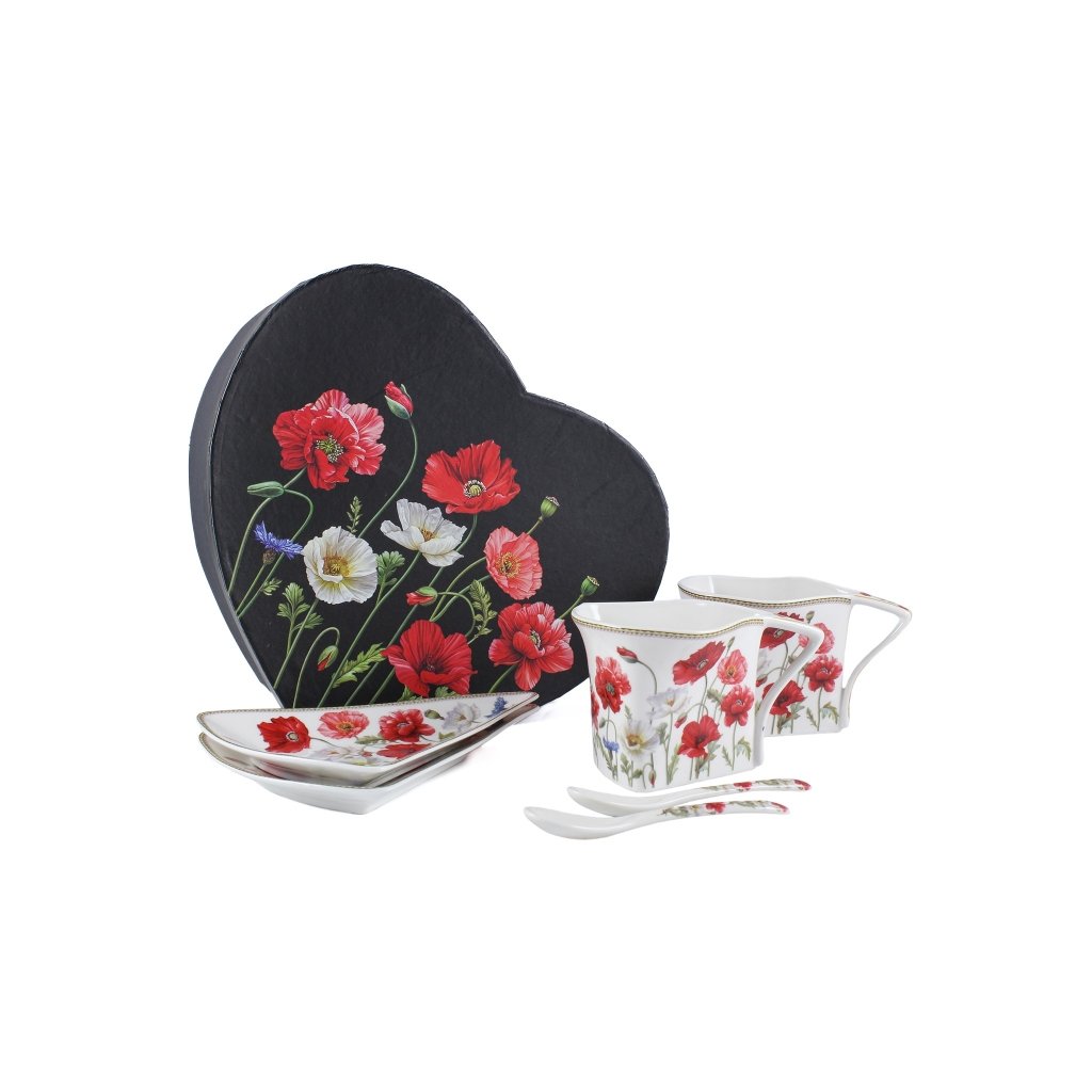 HOME ELEMENTS Set dvou šálků s trojúhelníkovými podšálky a lžičkami Máky bílé Home Elements