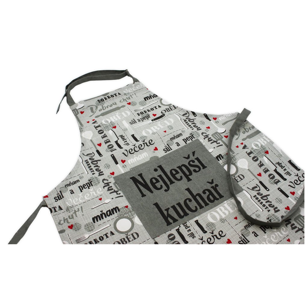 Slušivou kuchyňskou zástěru zdobí na šedé funkční kapse nápis Nejlepší kuchař. Zástěra má univerzální velikost, nastavitelné šedé šňůrky za krkem a libovolné zavazování v pase. Rozměr 60x80 cm.