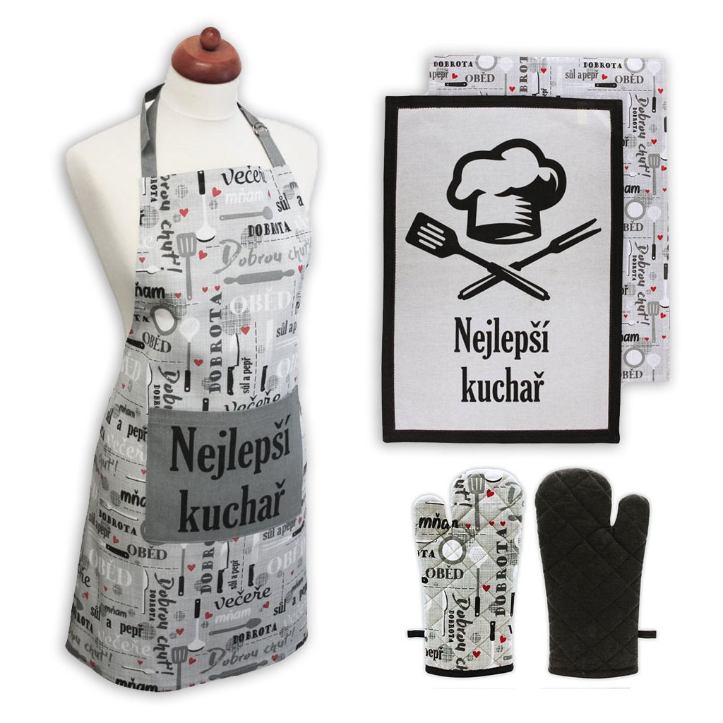 Kuchyňský set s nápisem "Nejlepší kuchař" obsahující zastěru, chňapku a dvě utěrky s motivem - ideální dárek pro Vaše nejbližší.