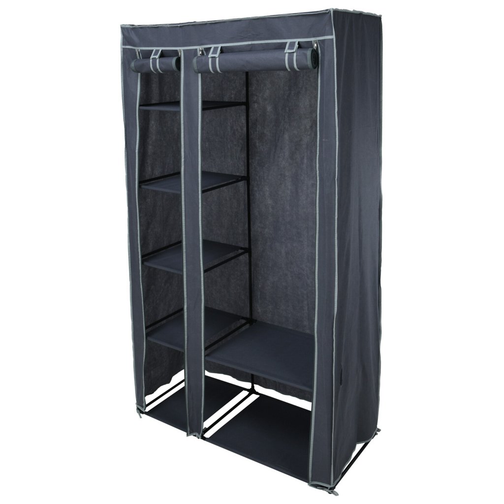 Velká látková skříň nabízí flexibilní úložný prostor pro oblečení. Kalhoty, svetry a další věci lze umístit do přihrádek, zatímco šaty, košile a halenky najdou místo na tyči na oblečení. Také boty, tašky a další doplňky jsou ve skládací šatní skříni uloženy přehledně a v mžiku. Skříň je ideální do ložnice nebo obývacího pokoje, do sklepa i na kempování. Praktický kryt se zipem chrání před prachem, vlhkostí a moly.