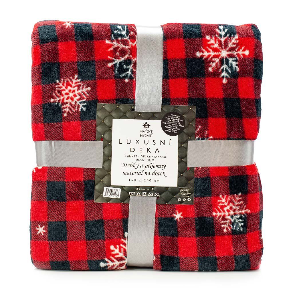 - Mikroplyšová deka s beránkem (150 × 200 cm) – hebká a hřejivá deka z mikroflanelu s gramáží 420 g/m². Károvaný vzor s vločkami dodává zimnímu interiéru útulnost a kouzlo. Odolná proti žmolkování, snadno se udržuje a rychle schne.